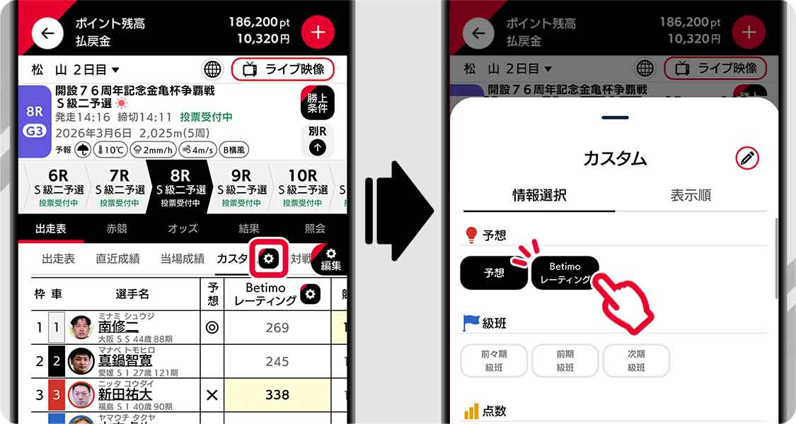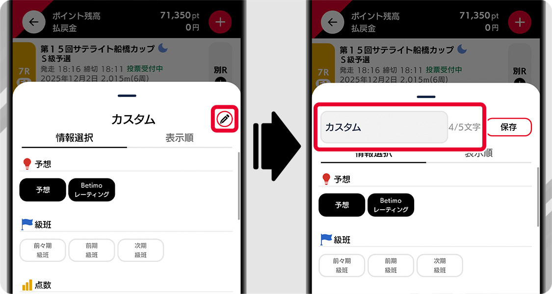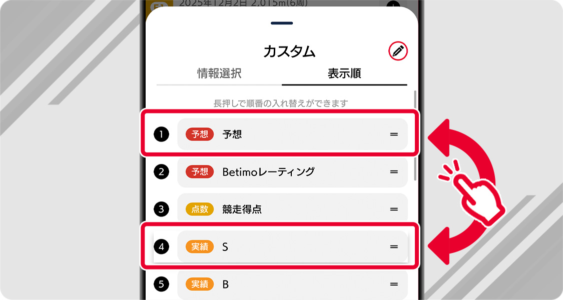 カスタム出走表の編集画面では、お好みの項目表示をON/OFFすることができ、自分だけの出走表を作ることができます。