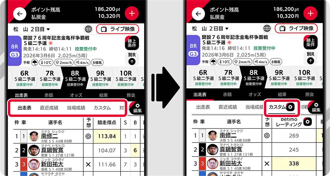 カスタム出走表とは、お客様が重要視される情報をご自身で取捨選択することができ、一人一人にフィットしたレース情報を素早く取得することができるBetimo独自の予想支援ツールです。カスタム出走表の項目にはBetimoが開発したBetimoレーティングや、豊富なデータにより皆様の予想補助をいたします。