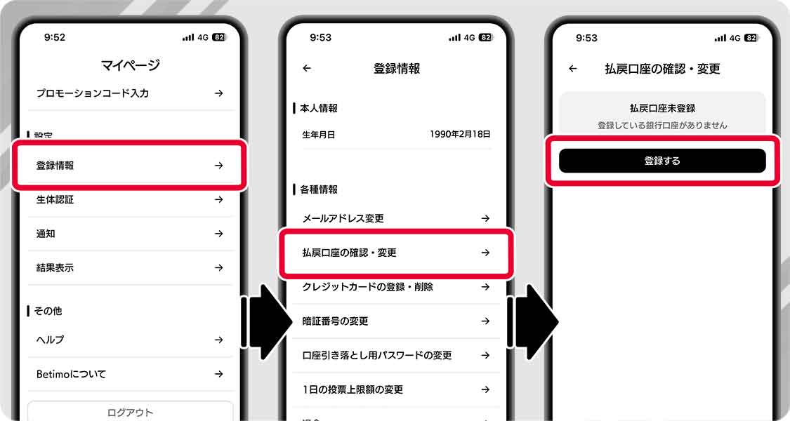 ヘルプ 払戻口座について 払戻口座の登録 マイページから払戻口座の登録を行えます。 お持ちの金融機関口座をご登録ください。 ご本人名義の普通口座のみが登録可能です。 払戻口座として利用可能な金融機関については、登録画面よりご確認ください。 払戻口座の変更方法 「マイページ」>「登録情報」>「払戻口座の確認・変更」から払戻口座の変更ができます。 金融機関の事情により、払戻口座として登録できるまでに時間を要する場合があります。 戻る