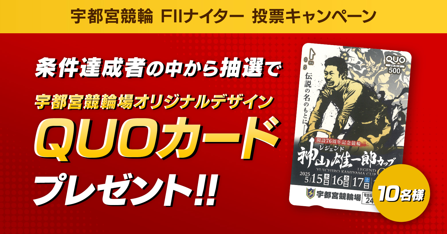 条件を達成されたお客さまの中から、抽選で10名様に「レジェンド神山雄一郎カップ(GIII)」オリジナルQUOカード(500円分)プレゼントいたします。