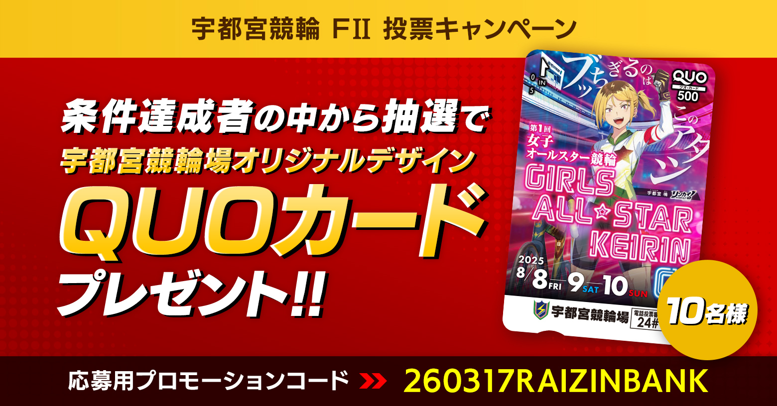 いつもBetimoをご利用いただき、誠にありがとうございます。2026/3/17(火)〜3/19(木)に、宇都宮競輪場で開催されるFIIレースを対象に、宇都宮競輪オリジナルQUOカード(500円分)が当たる投票キャンペーンを実施します!