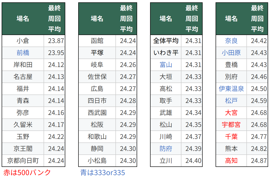 ちなみに全場平均は24.31秒となりました。当然ではありますが、この平均付近には多くの競輪場が並んでいます。