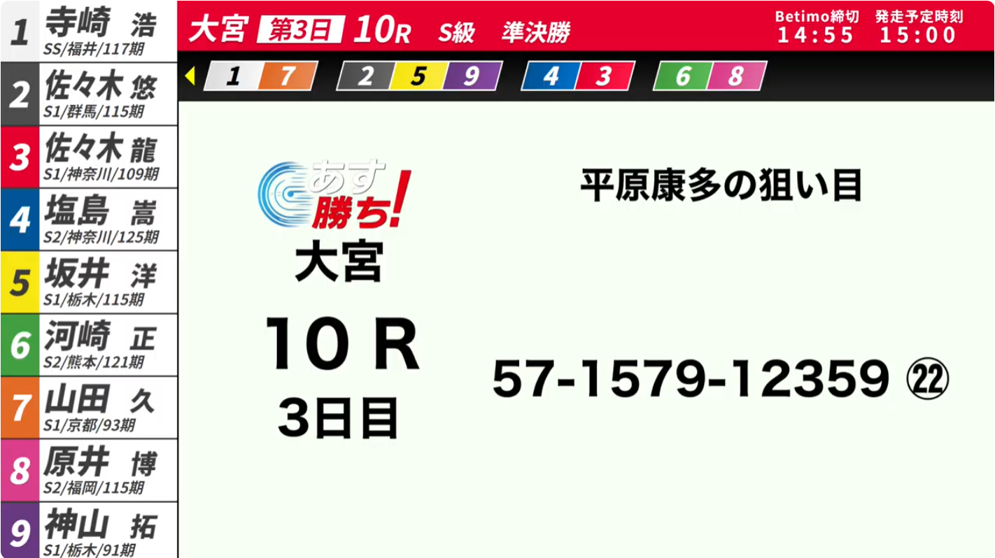 1月17日20時にも「あす勝ち!」は配信されます。平原康多さんの解説で、大宮記念3日目の振り返りと決勝の予想をお届けする予定です。