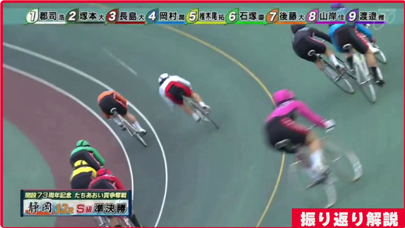 準決勝12Rは郡司選手のカマシを追走していた渡邉雅也選手でしたが、接触し大きく流れてきた塚本大樹選手の煽りをモロに受けてしまう形で郡司選手との連係が外れてしまいました。