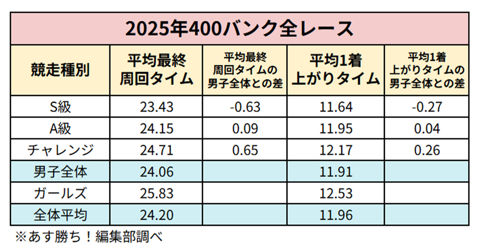 今回調査してみたのは「最終周回タイム」と「1着選手の上がりタイム」です。実際のレースで記録された数値の差を見てみましょう。対象は2025年の400バンク全レースです。