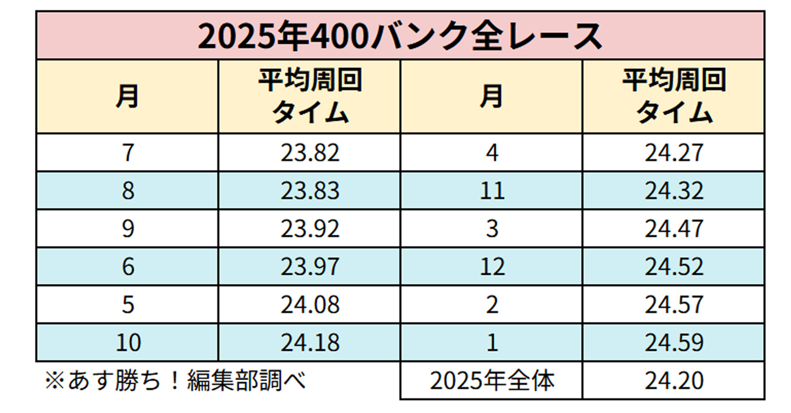 もう一つ調べました。それは月別の平均最終周回タイムです。こちらも2025年400バンク全レースを条件としました。
