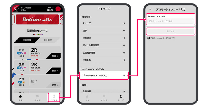 「トップ画面」左下「マイページ」を押下>「マイページ」内の「プロモーションコード入力」を押下>入力欄にプロモーションコードを入力して「確認する」を押下。