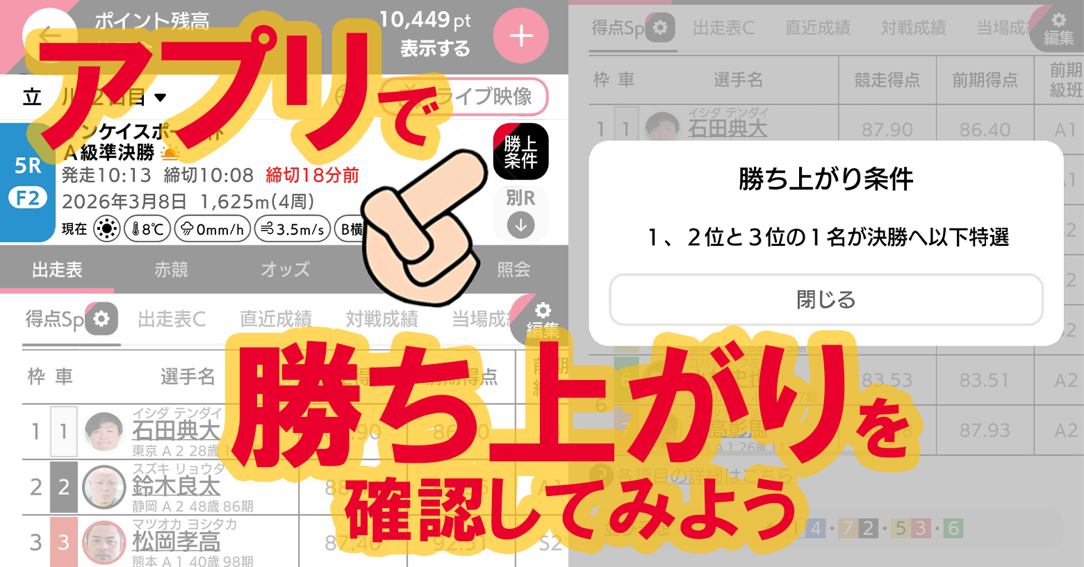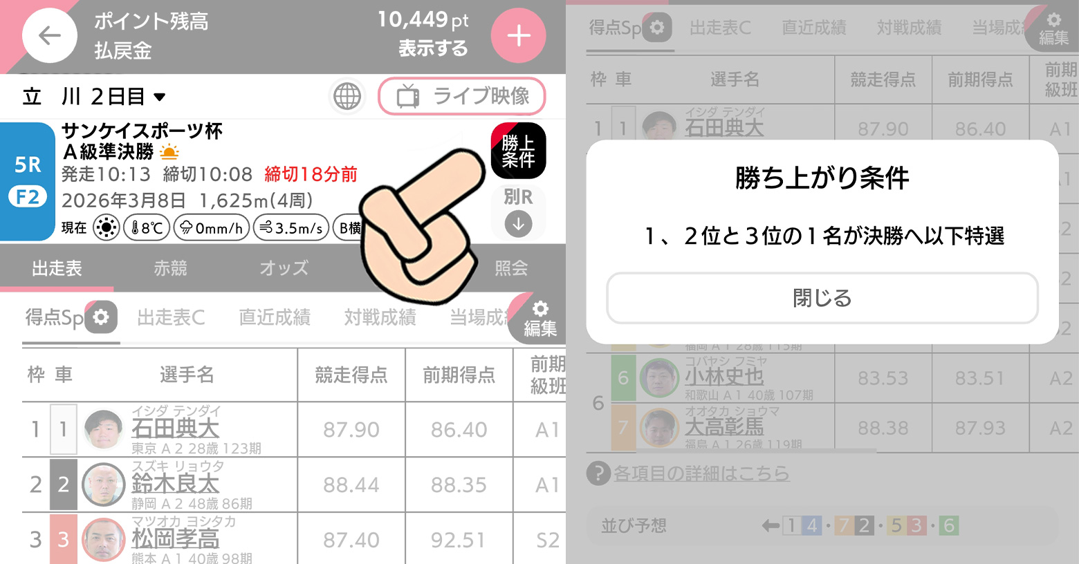 右上のボタンを押すと、そのレースの勝ち上がり条件がすぐわかります