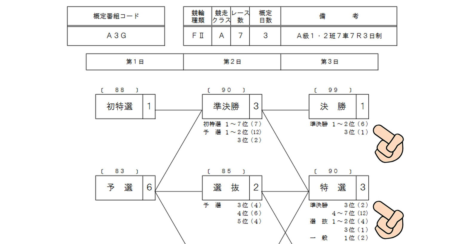 そんなトーナメントの形式はきちんと定められており、競輪ではそれを概定番組(がいていばんぐみ)といいます。そして概定番組の内容は、
