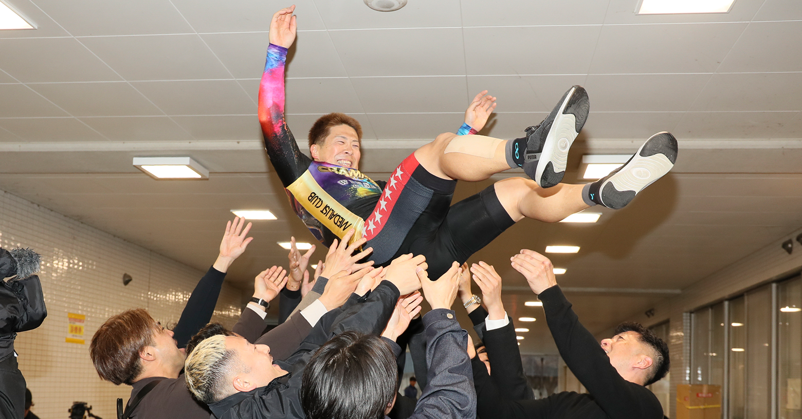 強力な関東のSSタッグを乗り越え、抜群のスピードを披露した深谷知広がVゴール。2着の眞杉匠を3車身引き離し、2023年9月の共同通信社杯以来となるビッグ制覇を達成。共同会見場で待っていた南関勢に迎えられ、宙を舞った深谷知広の笑顔がはじけた。