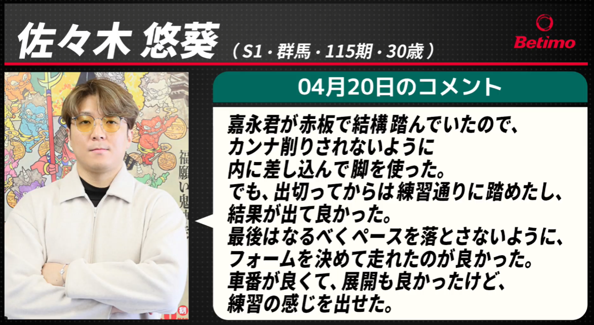 佐々木悠葵選手の明日はもちろん決勝戦12R、4番車での出走です。